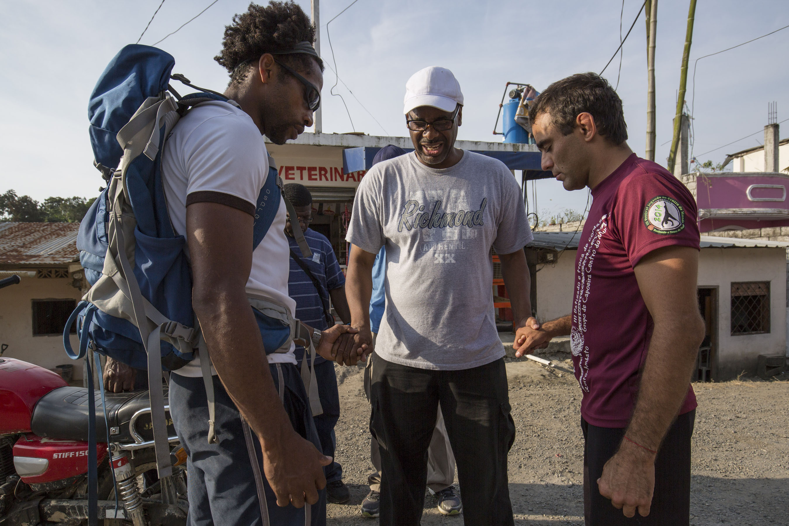 Billy Bell, right, pastor of New Creation Bible Church in Dallas, Texas, walks through the town of Lagarto, Ecuador, with Reggy Mabry and pastor Tony Mathews from North Garland Baptist Fellowship in Garland, Texas, during a vision trip there.